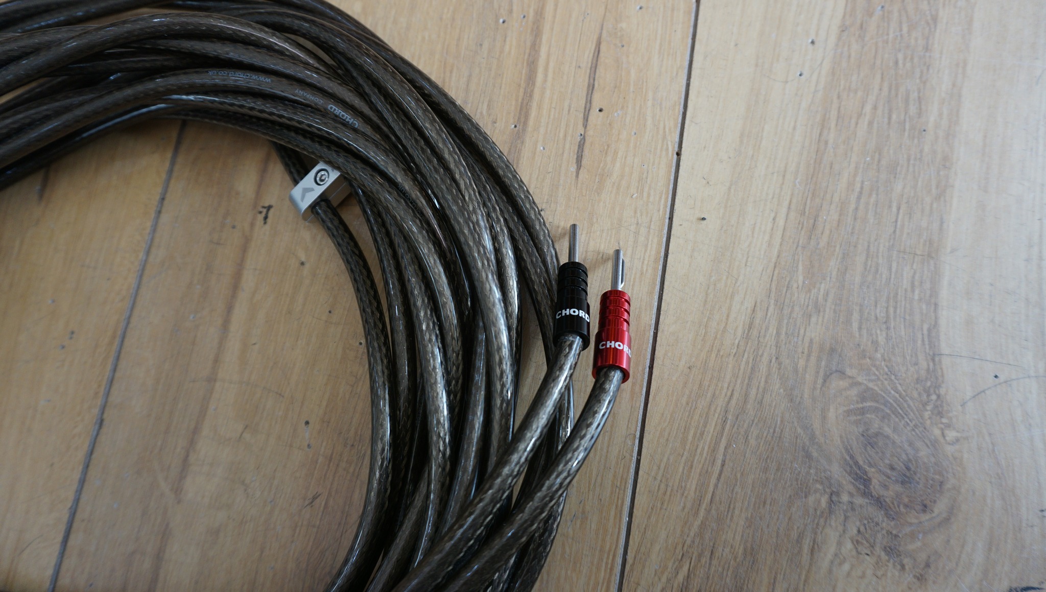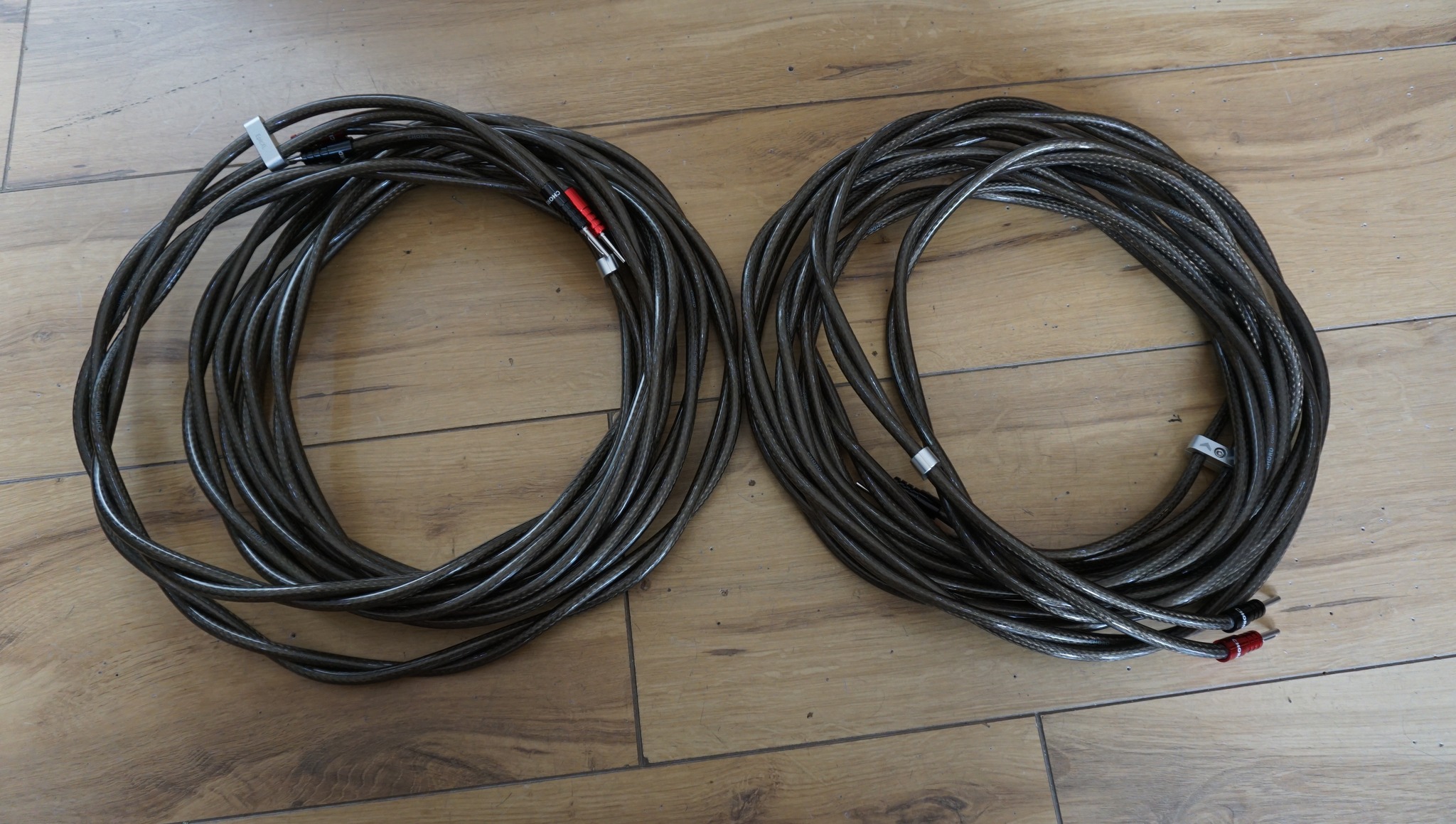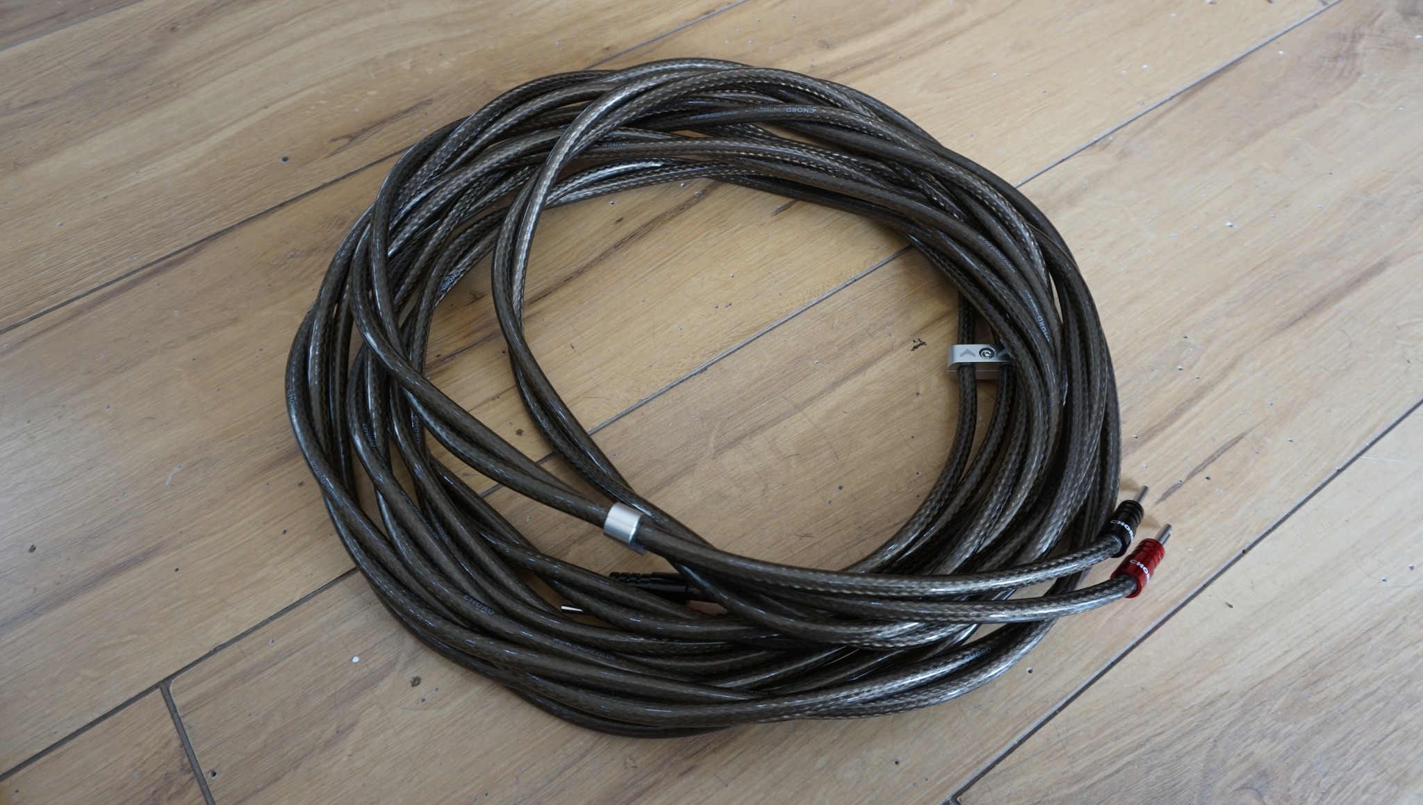 Excellent speaker cable factory terminated with Chord Ohmic plugs.